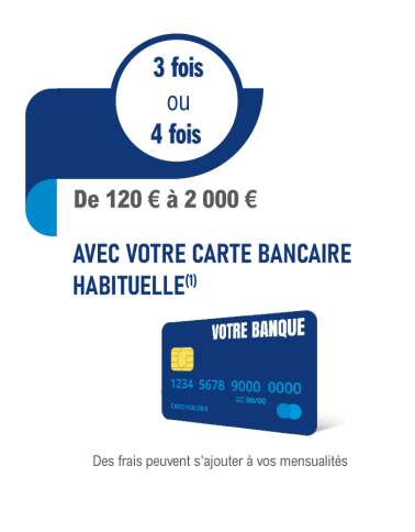 - La première mensualité est à payer le jour de l'achat avec une carte bancaire Visa ou Mastercard valide sur la durée du remboursement