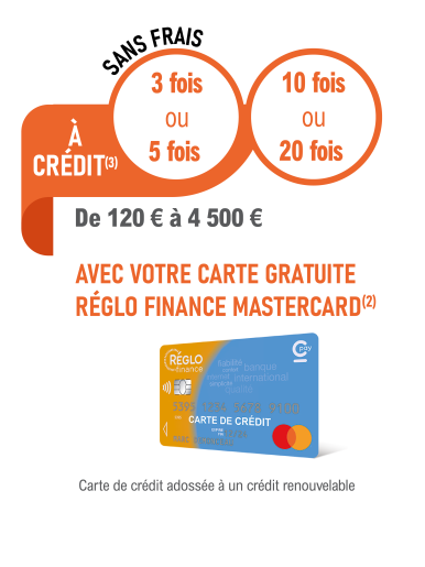 (2) La carte RÉGLO finance Cpay Mastercard est une carte de crédit adossée à un crédit renouvelable, facultative et gratuite de BNP Paribas Personal Finance. Vous pouvez l’utiliser dans la limite du montant disponible de votre crédit renouvelable, au comptant ou à crédit, sur choix exprès. Crédit renouvelable d’un an allant de 120 € à 4 500 €.
